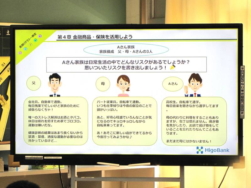 家族3人の生活に潜むリスクを洗い出し、どんな保険でリスクに備えられるかをタブレットを使って調べ、グループごとにディスカッションし、発表しながら議論を深めました。