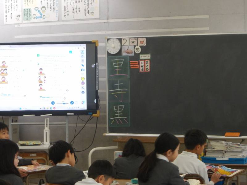 2年生です。黒板には漢字の書き順が色付けして書いてあります。毎日見て覚えていきましょう。