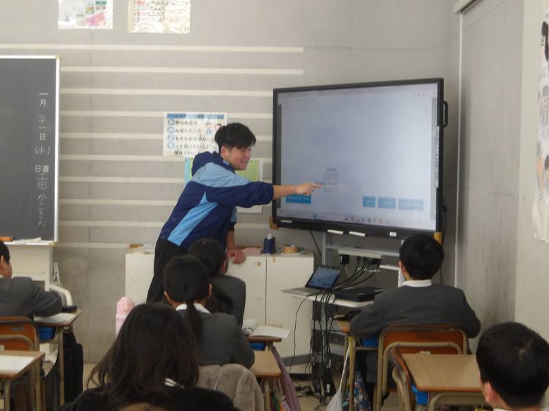電子黒板を使って、子どもたちの記憶に残るよう、身近なものや施設に例えながら進めています。