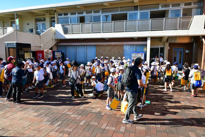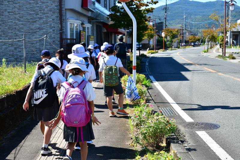 学校に帰ってからの給食を楽しみに、車に気をつけて帰ります。