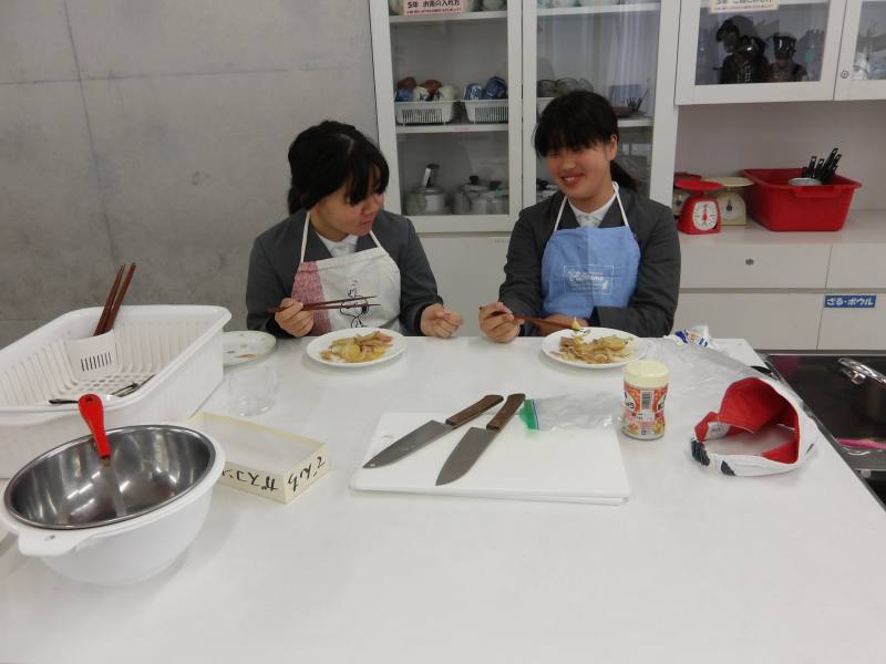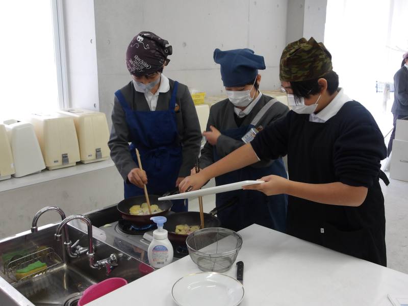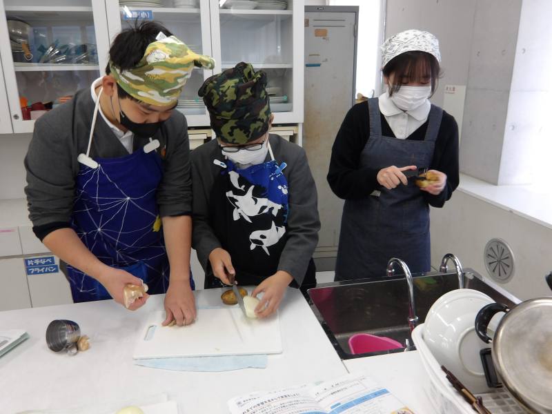 6年家庭科、調理実習です。今日の実習ではじゃがいもとベーコンとたまねぎを炒めます。