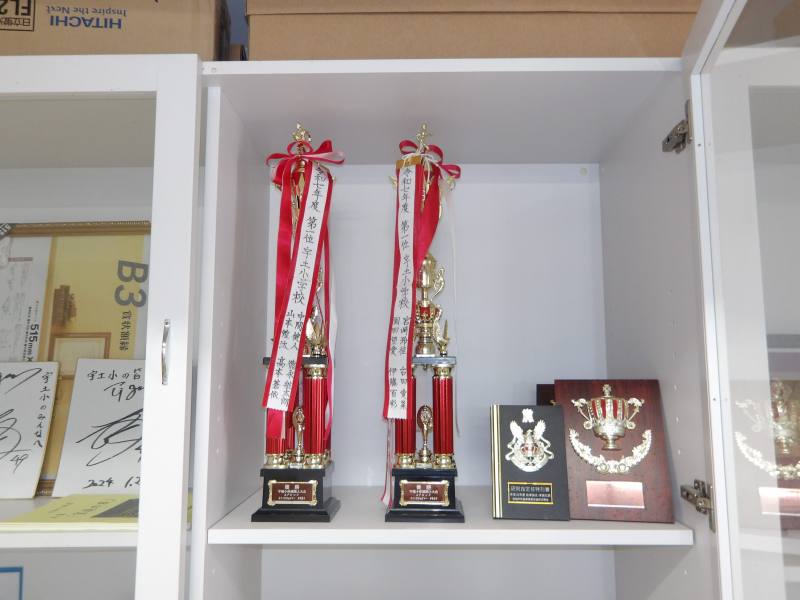 陸上記録会でもたくさんの5・6年生が選ばれ、校長先生から「おめでとうございます」の言葉と賞状、トロフィーを受け取りました。