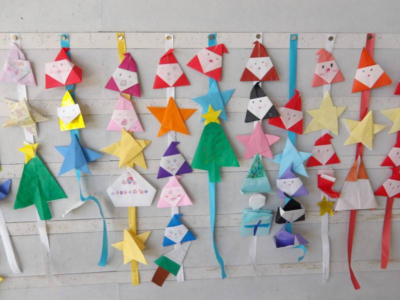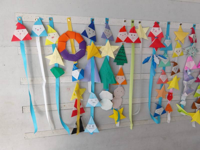 1年生の廊下はにぎやかです。いろんな顔のサンタさんがいてとってもかわいいです。