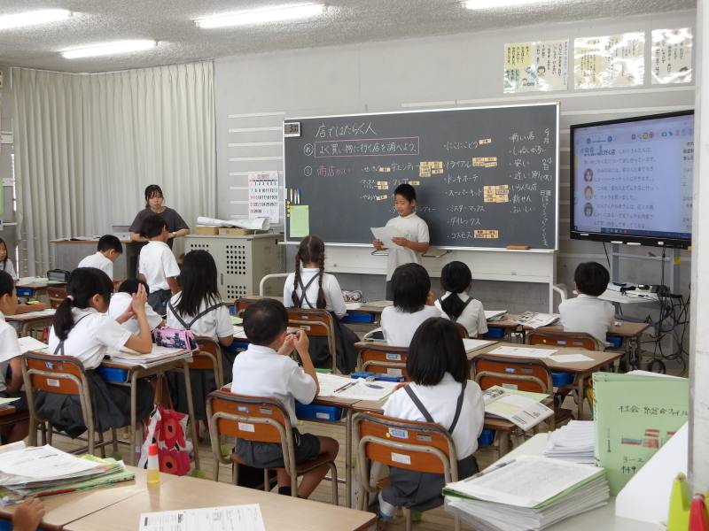 クラス全員が、自分がよく行くお店とその理由を発表していきます。
