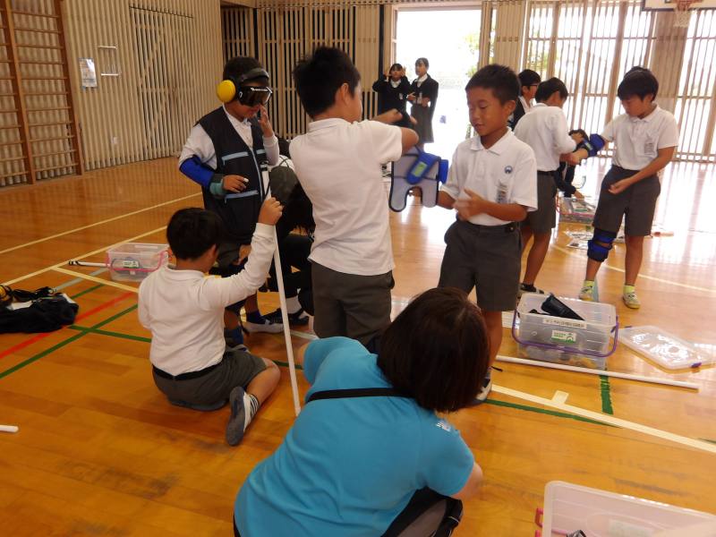装着中のこどもたちに感想を聞いてみると、「重たい!」「これ両方つけるの?」