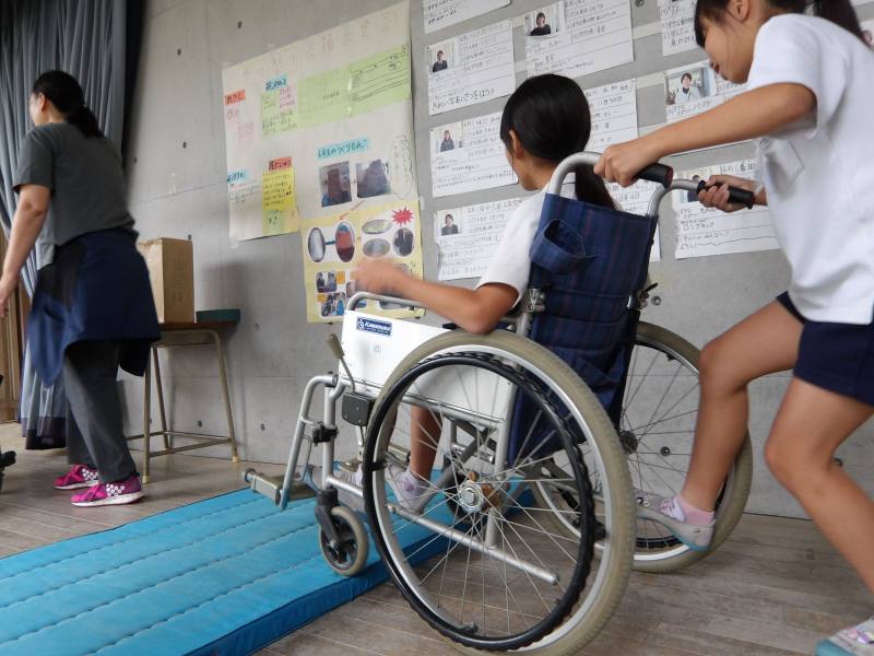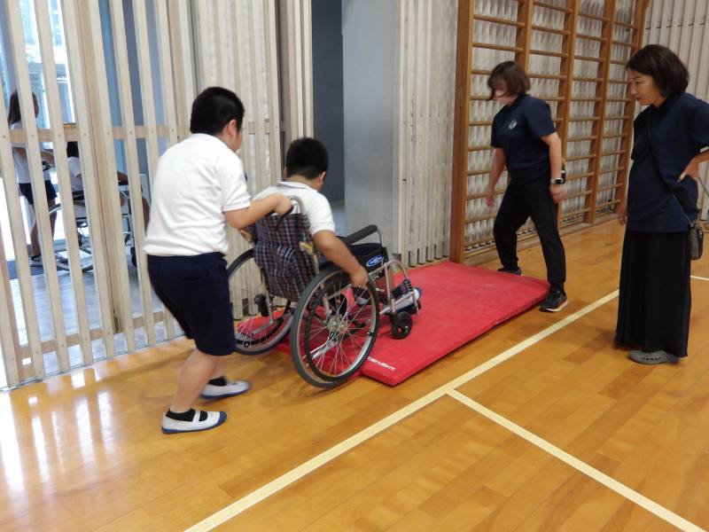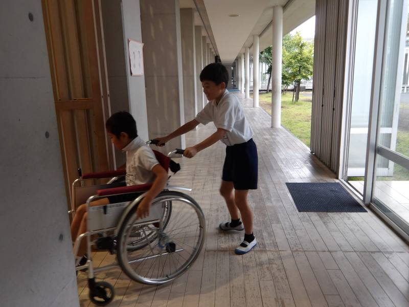 校舎の中に疑似段差や障害物をつくり、ペアを組んで車いすで回っています。