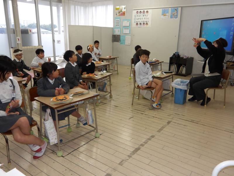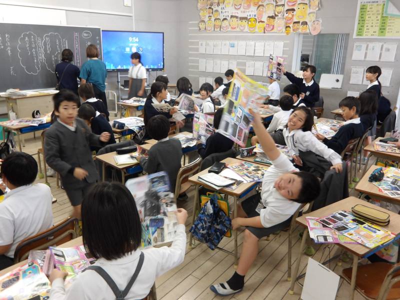 先生が 週末の宿題について話します。子どもたちが「漢字は1ページにしたい」と交渉します。