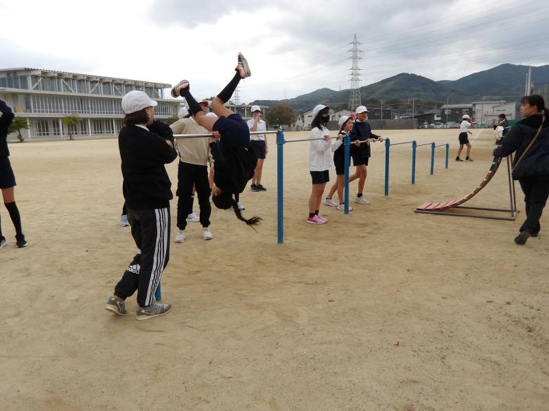 寒空の下、2年生を見送りつつ、6年生が鉄棒をしています。