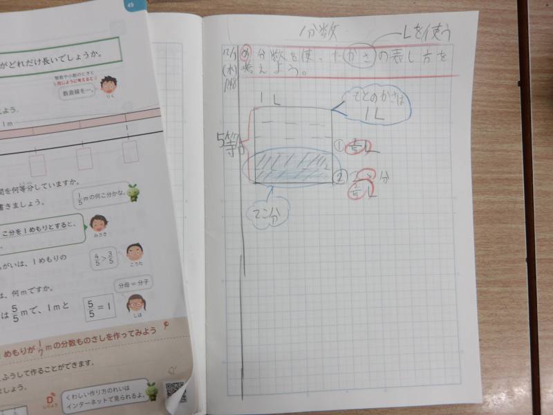 「もとのかさは1Lです。1Lを5等分して、その・・・・・」