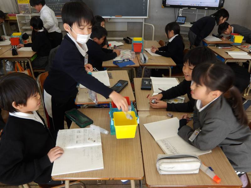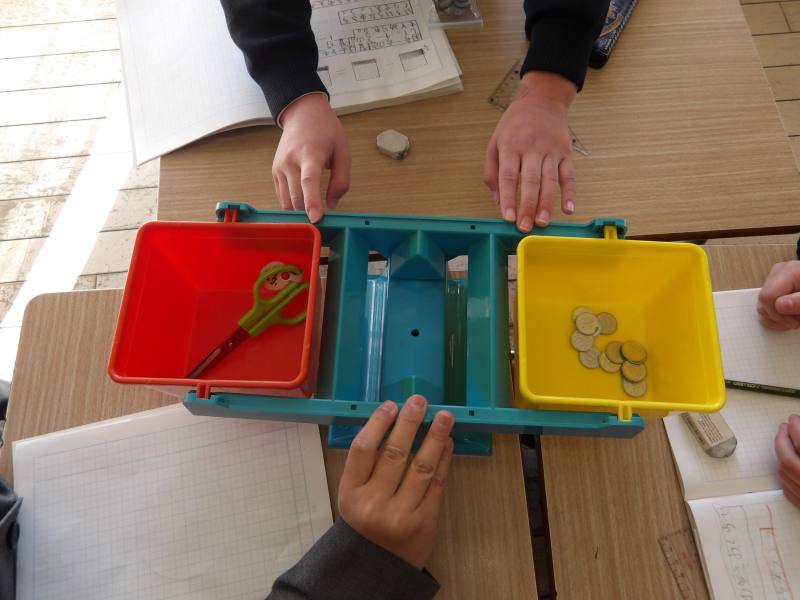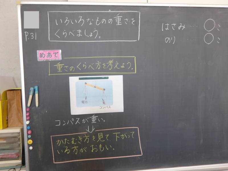 天秤を使って重さ比べをしています。 一円玉とハサミやえんぴつ、消しゴムなどを使い、実際に一円玉何枚分か量ってみます。