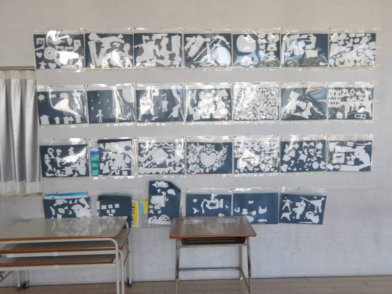 2年生の廊下には、図工の時間に白い紙を切り貼りして作ったものが飾られています。素敵な作品ばかりです。
