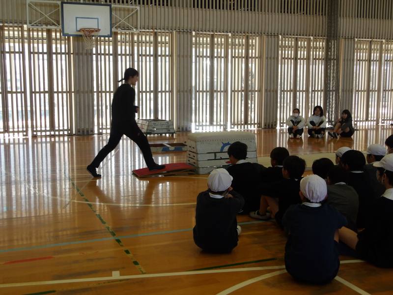 跳び箱の練習を始める前に「まずはケガがないように」と先生がどのように飛ぶのかを説明しました。冬は体が動きにくいので、しっかり準備運動をして体を温めてからチャレンジしてください。