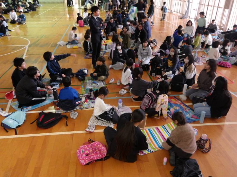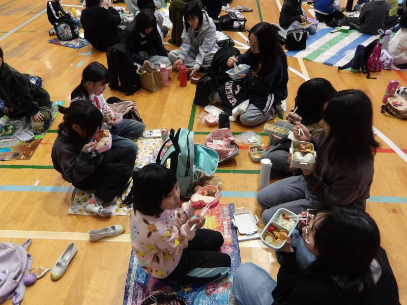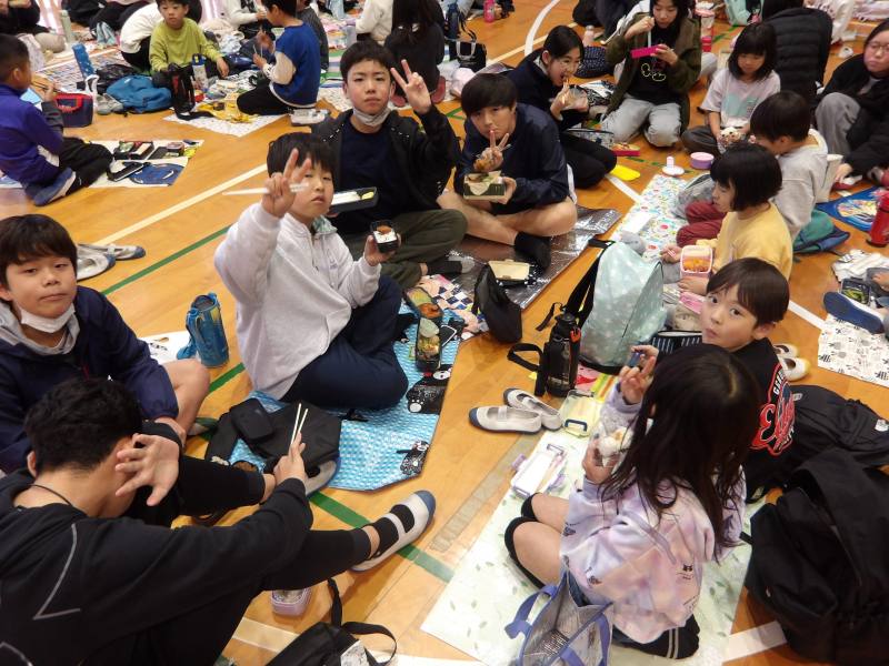 この日のお昼ご飯は、6年生と1年生が一緒に体育館でお弁当を食べます。