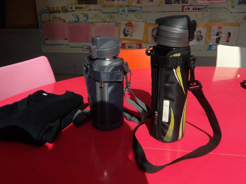 保護者の方へお知らせです。遠足の日に水筒二つと150のセーターの落とし物がありました。